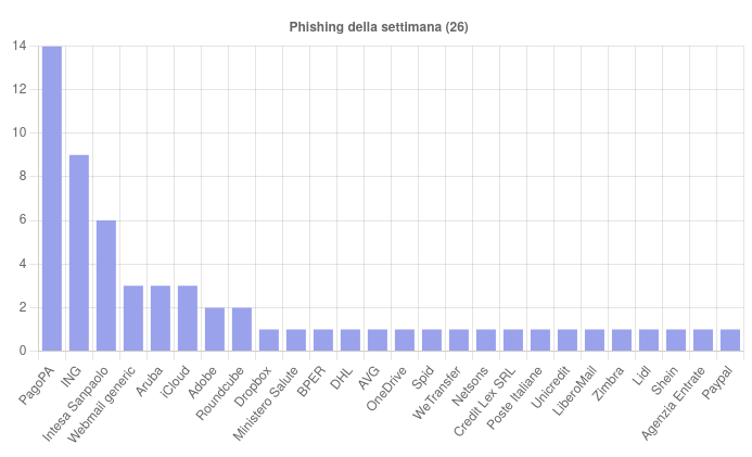 Nel corso della settimana sono stati coinvolti ventisei brand in campagne di phishing dirette o indirette verso utenti italiani.