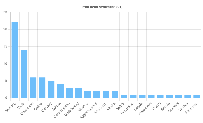 Nel corso della settimana, il CERT-AGID ha individuato ventuno diversi temi sfruttati dai criminali informatici per diffondere campagne malevole in Italia.