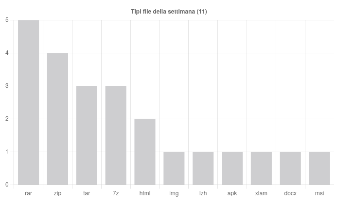 In totale sono state individuate undici diverse tipologie di file, ma a sorpresa non è il classico formato ZIP a dominare la scena: con quattro utilizzi si posiziona infatti al secondo posto, superato dal formato RAR, che questa settimana è stato impiegato in cinque diverse campagne. In terza posizione si collocano i formati TAR e 7Z, entrambi utilizzati in tre occasioni.