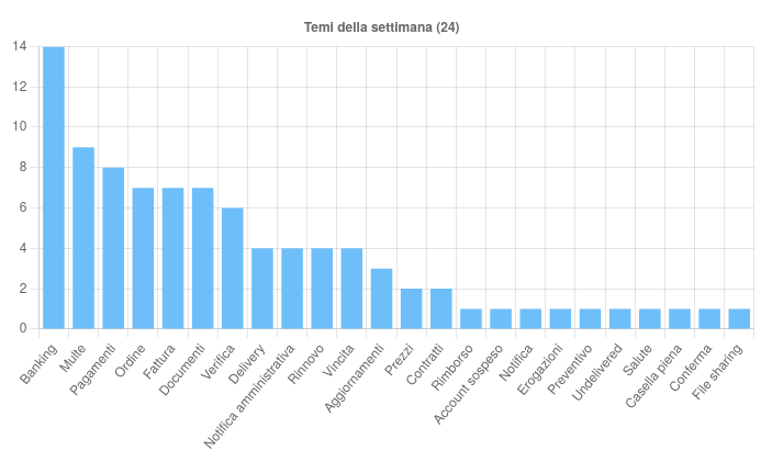 Sono 24 i temi sfruttati dai criminali informatici per veicolare campagne di phishing e malware. Tra i più ricorrenti figurano i riferimenti a Banking, Multe, Pagamenti, Documenti e Ordini, che continuano a rappresentare i vettori preferiti per colpire utenti e aziende italiane.
