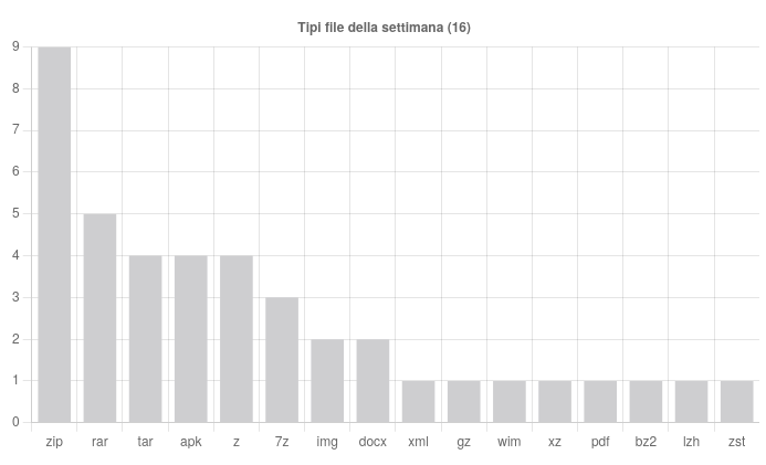 Nel periodo considerato sono state individuate 16 tipologie di file, con ZIP al primo posto (9 utilizzi), seguito da RAR (5). Con 4 utilizzi figurano TAR, APK e Z, mentre 7Z è stato osservato in 3 campagne.