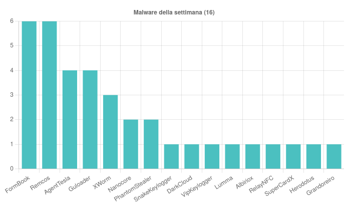 Sono 16 le famiglie di malware rilevate tra il 22 e il 28 novembre. FormBook è stato impiegato in sei campagne generiche distribuite tramite allegati ZIP, RAR e DOCX, sfruttando i temi “Pagamenti”, “Fattura”, “Prezzi” e “Delivery”.