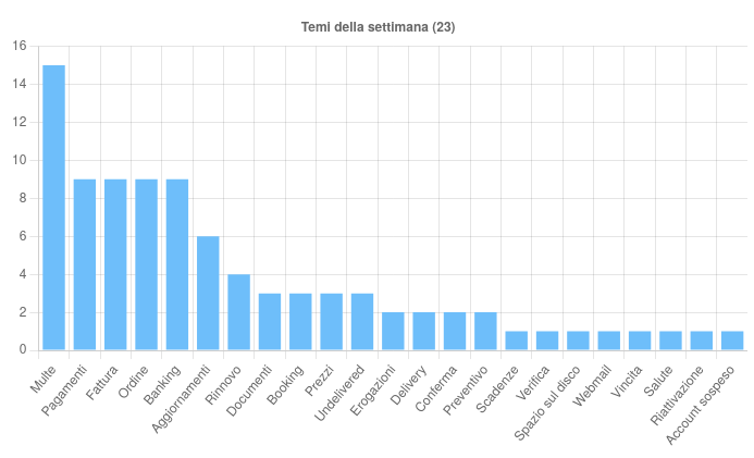 Sono 23 i temi sfruttati dai criminali informatici, con una forte prevalenza di phishing a tema multe, fatture, pagamenti, banking e ordini.