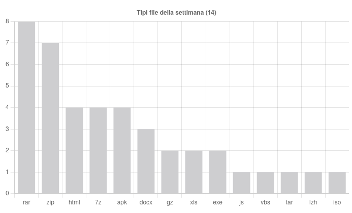 Gli archivi compressi restano il principale vettore di distribuzione dei contenuti malevoli. Nel periodo osservato sono state rilevate 14 tipologie di file, con RAR al primo posto (8 utilizzi), seguito da ZIP (7).