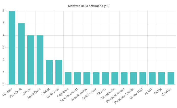 In parallelo, attività malware hanno diffuso varianti come Copybara, AgentTesla, Lokibot, GoldFactory e PhantomStealer, confermando l’interesse costante dei criminali verso le credenziali finanziarie.