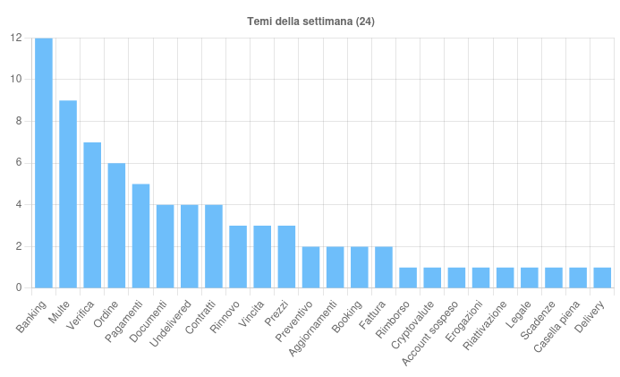 Sono 24 i temi utilizzati dai criminali per diffondere phishing e malware, con una prevalenza di attività legate a banking, multe, verifiche documentali e ordini commerciali.
